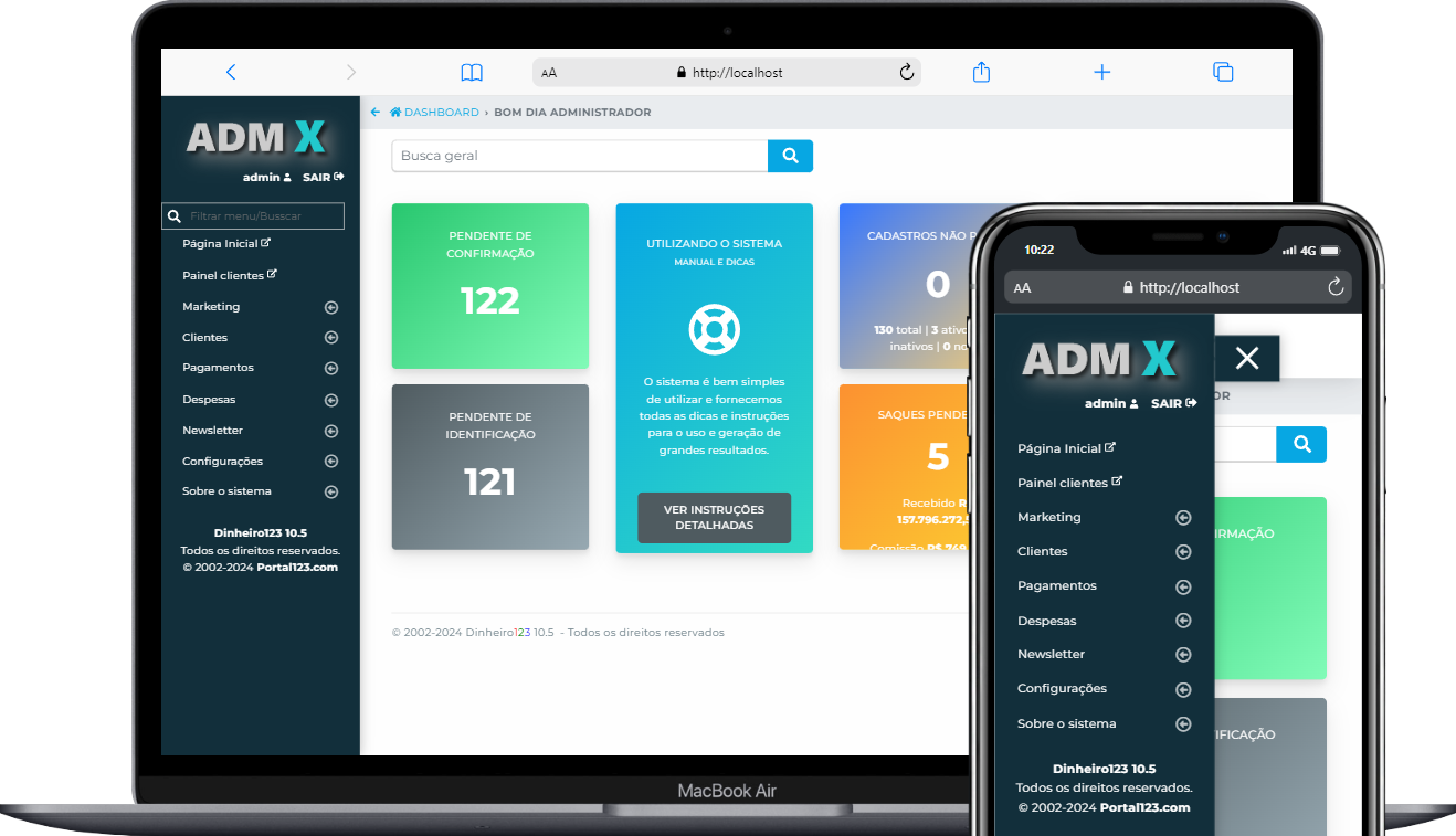 Gerencie todo o sistema, configurações, usuários e relatórios completos