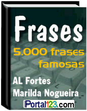 "Parabenizo ao Portal123.com por disponibilizar uma obra tão rica ao seu público. Eu sempre procurei por um livro assim que além de agradável nos trás conhecimentos." José Maria Nascimento (Manaus) "...depois que passei a transcrever as frases na minha coluna mensal e comentá-las, o retorno foi tão positivo, que agora escrevo semanalmente. Já indiquei seu e-book a vários amigos como uma forma de agradecimento." Everton S. Serrano (jornalista - São Paulo) "o livro é excelente, eu o utilizo em meus trabalhos para faculdade e já ganhei vários elogios de colegas e professores com as frases que eu coloco nos meus trabalhos. Parabéns aos autores. Mandem notícias dos novos lançamentos." Fabiana Cristina Pereira Ferraz (estudante de psicologia - Belo Horizonte) "...sempre gostei de uma boa leitura e de praxe, costumo anotar todas as frases interessantes para que eu possa, a partir delas, mudar minha maneira de viver. Assim surgiu a idéia do livro Frases onde, em uma única obra, obtemos conhecimentos adquiridos em milhares de anos..." AL Fortes (Autor do livro) "...ao receber o convite, achei interessante a obra e, ao longo de quase dois anos, selecionando as frases, tenho plena convicção de ser a melhor obra já publicada em todos os tempos pois reúne a essência dos grandes escritores em único livro..." Marilda Nogueira (Autora do livro) Para enviar seu testemunho utilize o "fale conosco" abaixo. Coloque nome, profissão e cidade.